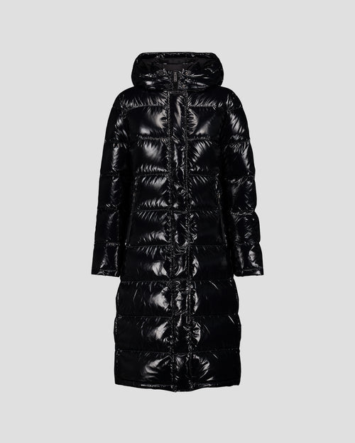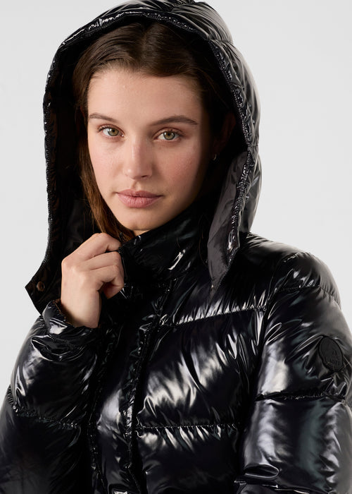 Cette doudoune longue mise sur l'effet brillant de son tissu laqué pour un look affirmé. Sa silhouette couvrante et sa capuche amovible en font une pièce hivernale aussi chaude que stylée.